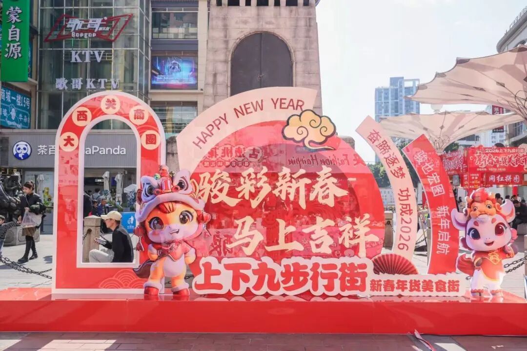 首先锁定北广场主题装置,马跃新春、金马贺岁等设计互动感十足,站在这里随便一拍都是新年大片。旁边的马踏飞燕雕塑古韵与新潮碰撞,线条流畅极具艺术感,是步行街里的标志性打卡C位。还有百年老字号皇上皇骑楼门面,复古西关骑楼搭配经典招牌,藏着老广州的商业底蕴与烟火气,拍出来既有复古质感,又满是新年喜气。