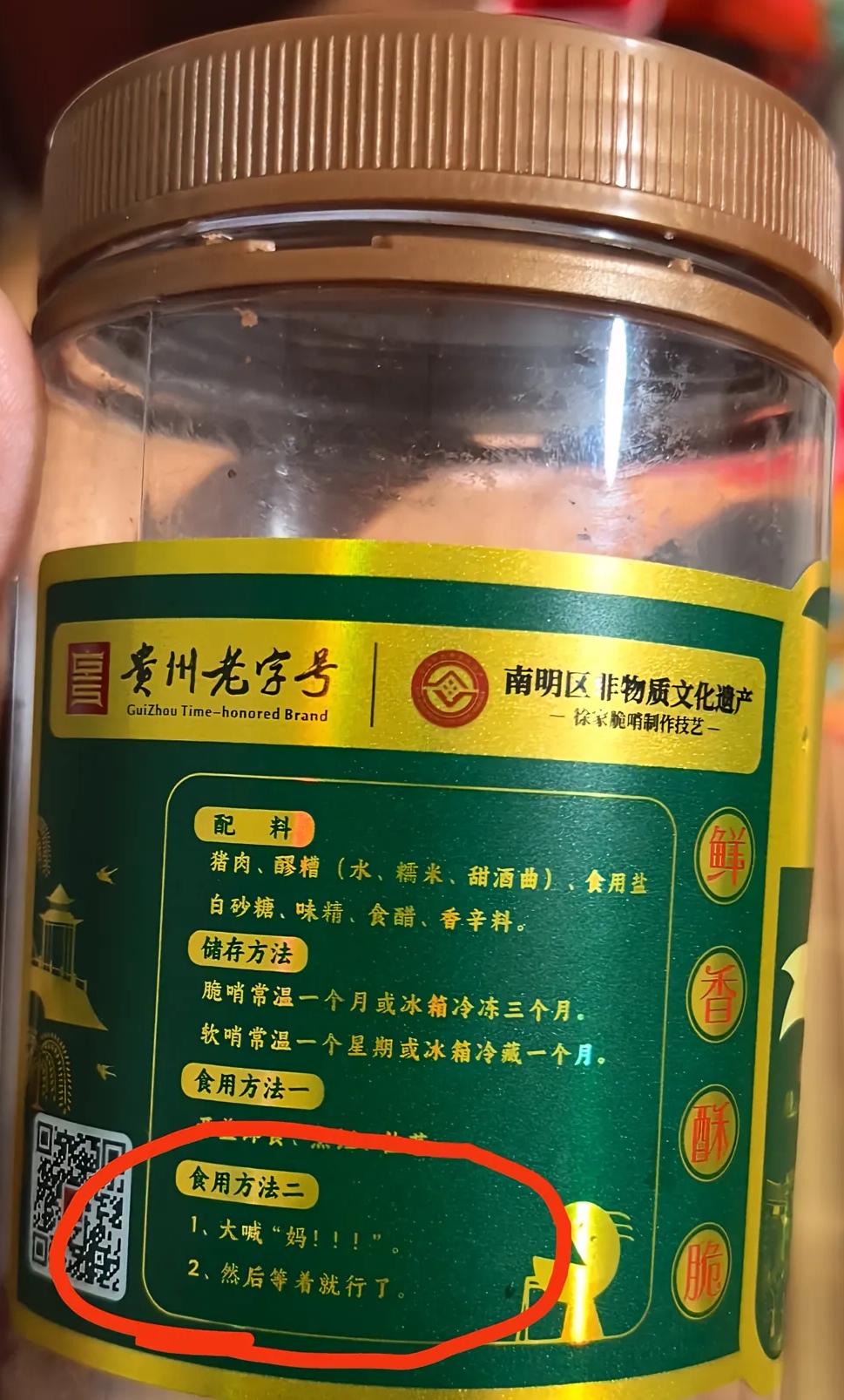 多位网友在社交平台发布的该款脆哨包装显示,食用方法一:开盖即食,烹饪,佐菜。下方还跟了另外一个食用方法:大喊“妈!!!”然后等着就行了。