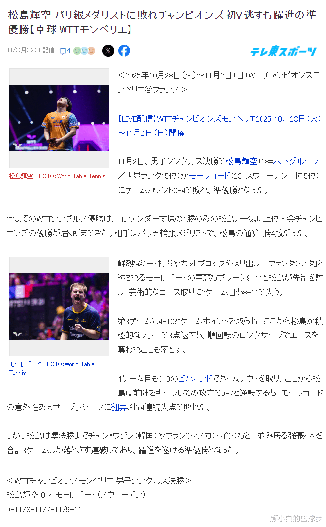 2025年WTT蒙彼利埃冠军赛男单决赛,松岛辉空0-4惨败莫雷加德无缘夺冠,四局比分:9-11、8-11、7-11、9-11。在输掉比赛后18岁的日乒小将松岛辉空是仰天长叹,他又一次跟WTT1000+赛事的冠军擦肩而过。