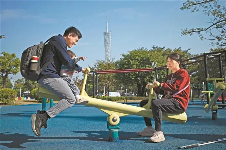 2025年12月16日,静睿、暖暖和宝宝念念在二沙岛体育公园晒太阳,一家三口一起玩跷跷板。