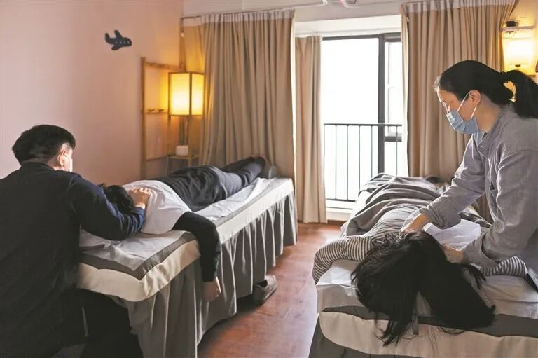 2025年2月18日,广州市万胜围,静睿和暖暖在推拿工作室内给客人按摩。